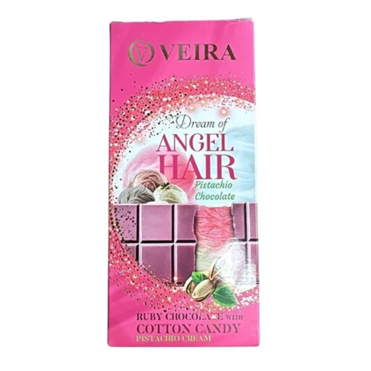 ANGEL HAIR MILK CHOCOLATE PISTACHIO es una obra de arte comestible que combina lo clásico con lo exótico.El suave chocolate con leche se derrite primero, el dulce y fibroso Cabello de Ángel ofrece una textura única, los pistachos completan la mordida con su sabor elegante.
