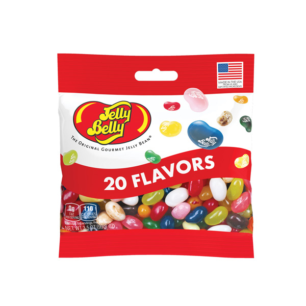 Grageas de diferentes 20 sabores. Sabores: Arandano, mora azul, goma de mascar, palomitas de maíz con mantequilla, coco, algodón de azúcar, manzana verde, jugo de pera, Limón Sunkist, lima-limón, regaliz, sorbete de naranja, durazno, canela picante, cheescake de fresa, mandarina Sunkist, marshmallow tostados, multi fruta, cereza, sandia.