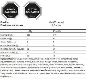Grageas de diferentes sabores tropicales. Sabores: mora azul, cantalupo, coco, piña molida, manzana verde, isla paraiso, kiwi, Limón Sunkist, lima-limón, mango, durazno, piña colada, Toronja rosa Sunkist, Mandarina Sunkist, Banana superior.
