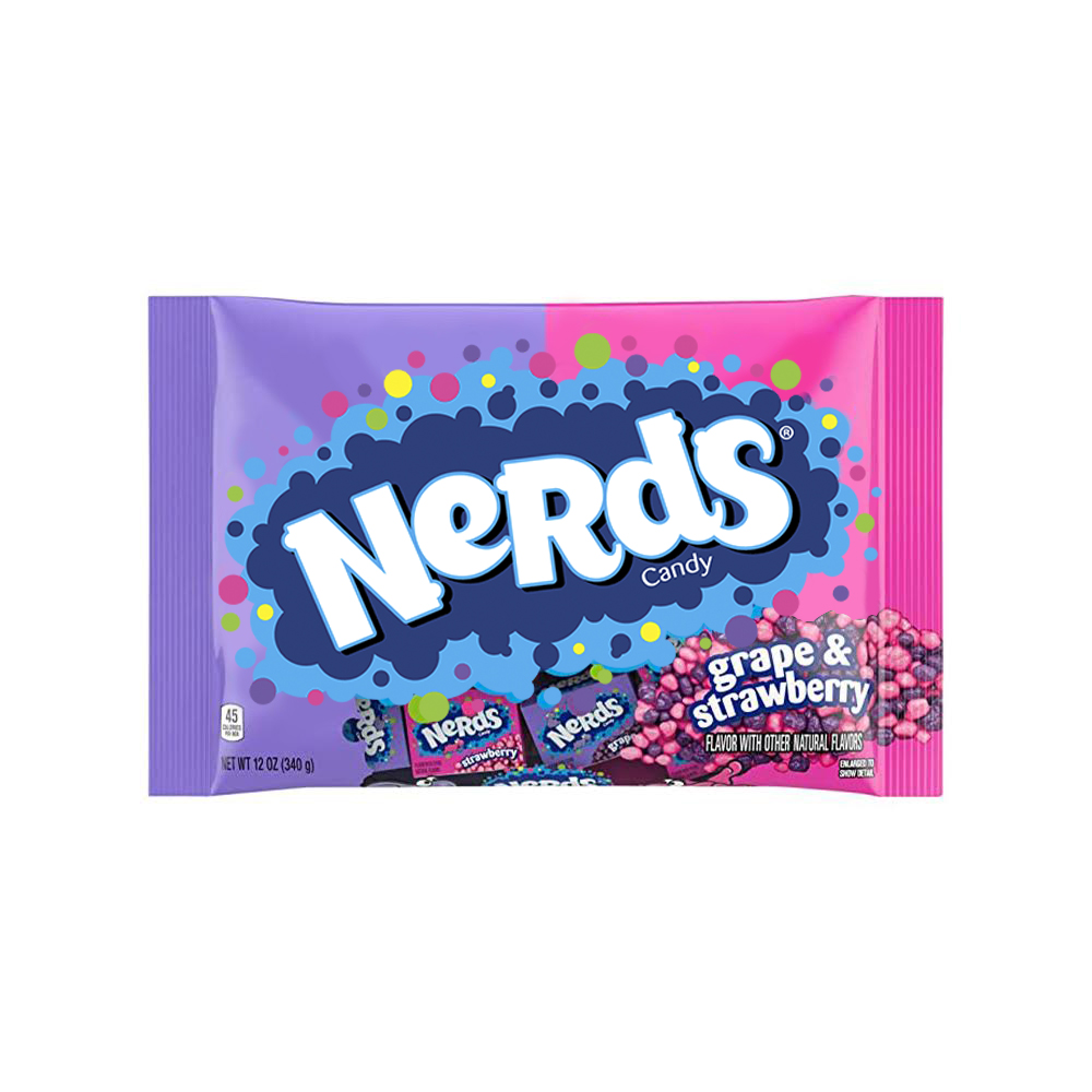 Bolsa formato conveniente ideal para compartir con mini cajitas de Nerds surtidas, sabores uva y frutilla, bolsa de 340 gramos.