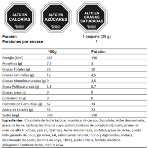 PACK CON 39 GRS DE CHOCOLATE CON LECHE RELLENO DE MANTEQUILLA DE MANI Y CARAMELO.